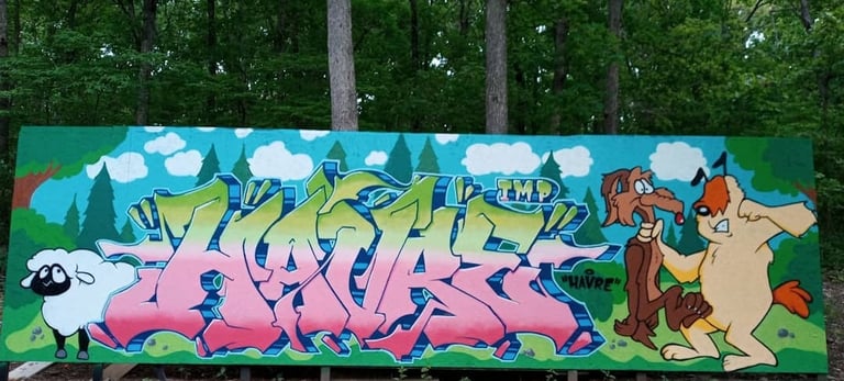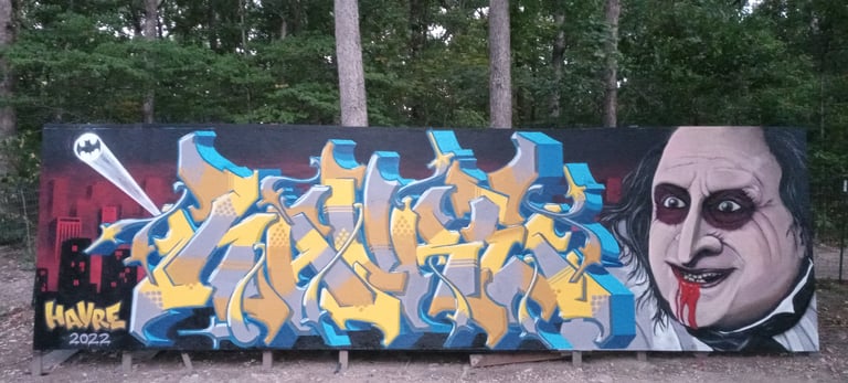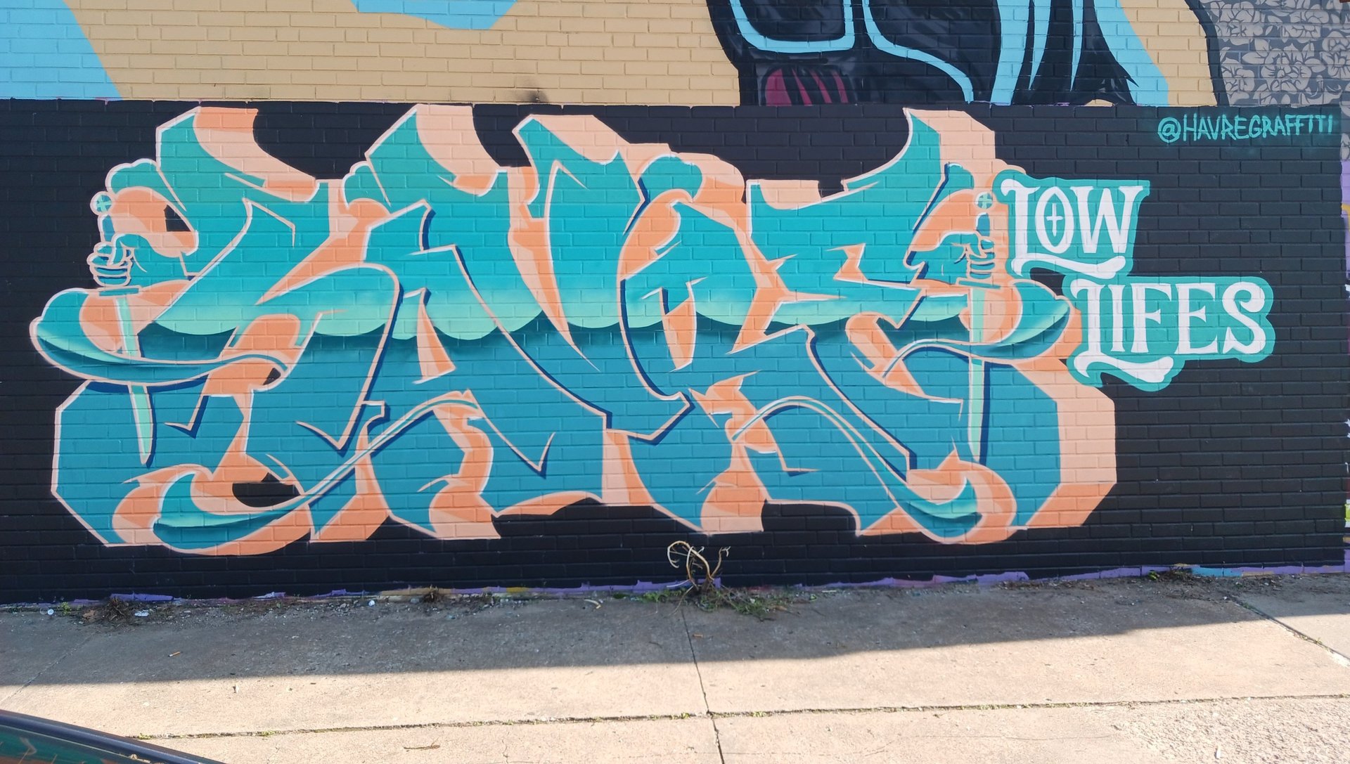 These stylized letters can be stretched, twisted, overlapped, or filled with extra details, making them look more like abstract art than regular handwriting. For those outside the graffiti community, this can make the names look like a secret code. Over time, artists develop their own visual language, and part of the fun and challenge is in deciphering and appreciating these unique signatures. As you can see in the gallery, HAVRE's graffiti tag (lettering) takes on varying styles and elements throughout his graffiti career-but they all say "HAVRE."